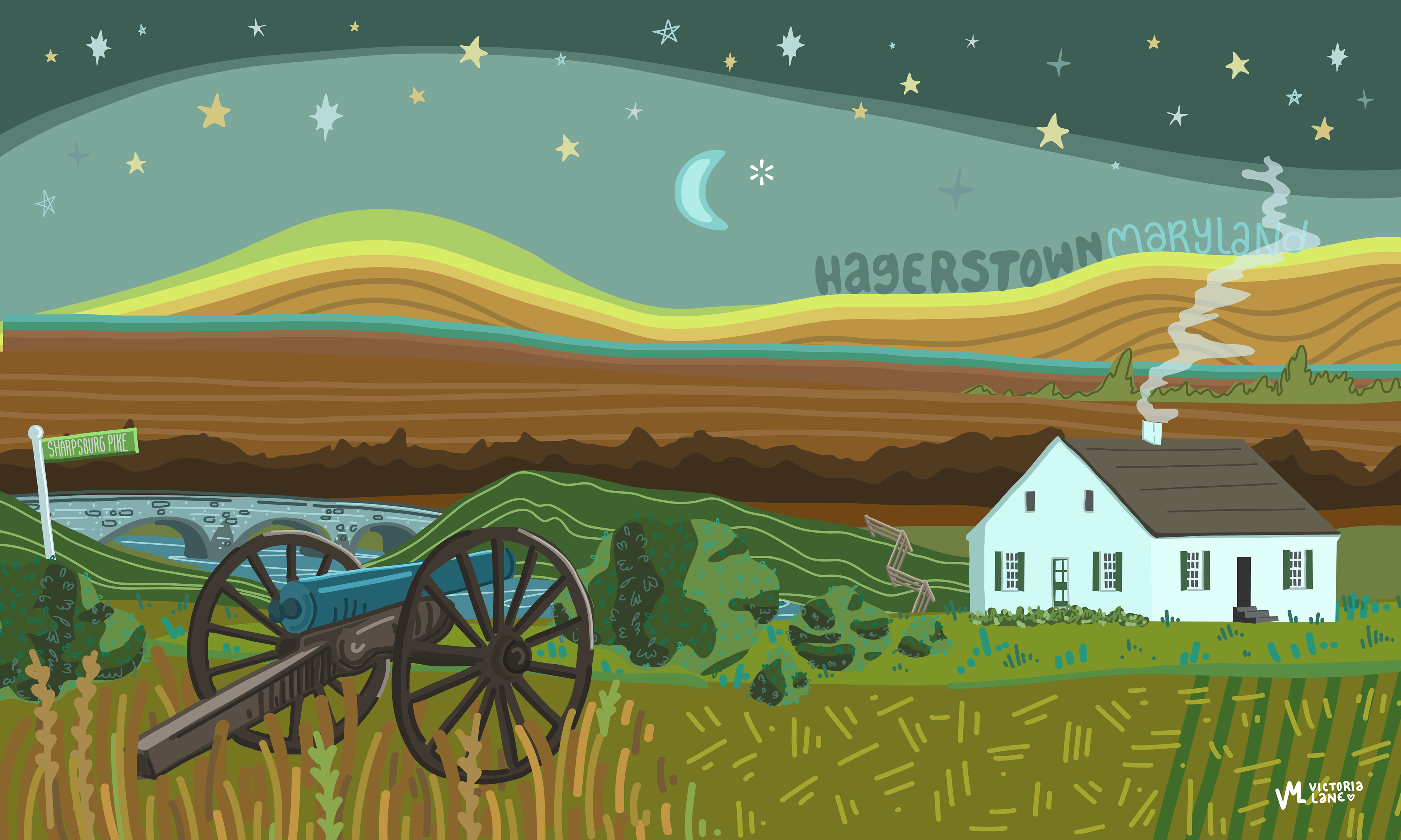 “These Hills Have History” was inspired by the natural beauty and complex historical significance of Hagerstown and depicts a collage-like view of Antietam National Battlefield.